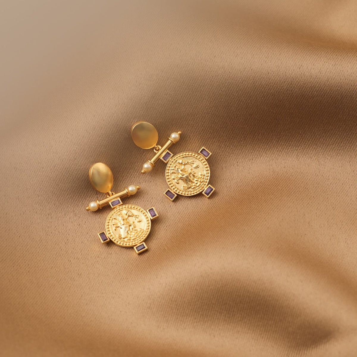 These Zodiac drop earrings are artfully crafted to depict the water carrier- Aquarius zodiac symbol for January 20 – February 18 birthdays and the round Amethyst adds a colorful splash. Set in satin 14kt yellow gold 925 silver, these are perfect for a vintage appeal and make such a thoughtful gift.