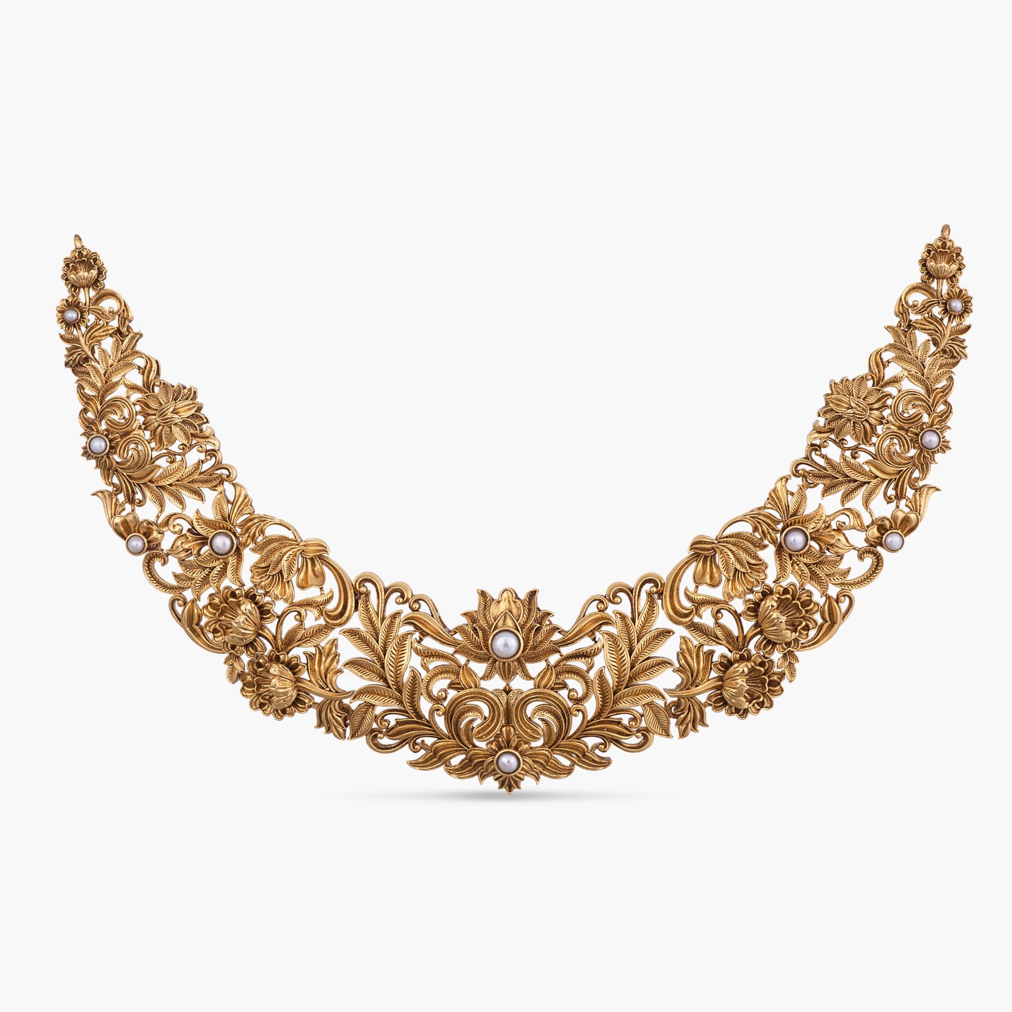 Handcrafted in 925 silvers, this statement necklace showcases bold floral cutwork adorned with pearls. A stunning piece that blends intricate craftsmanship with timeless elegance, ideal for weddings and special occasions.