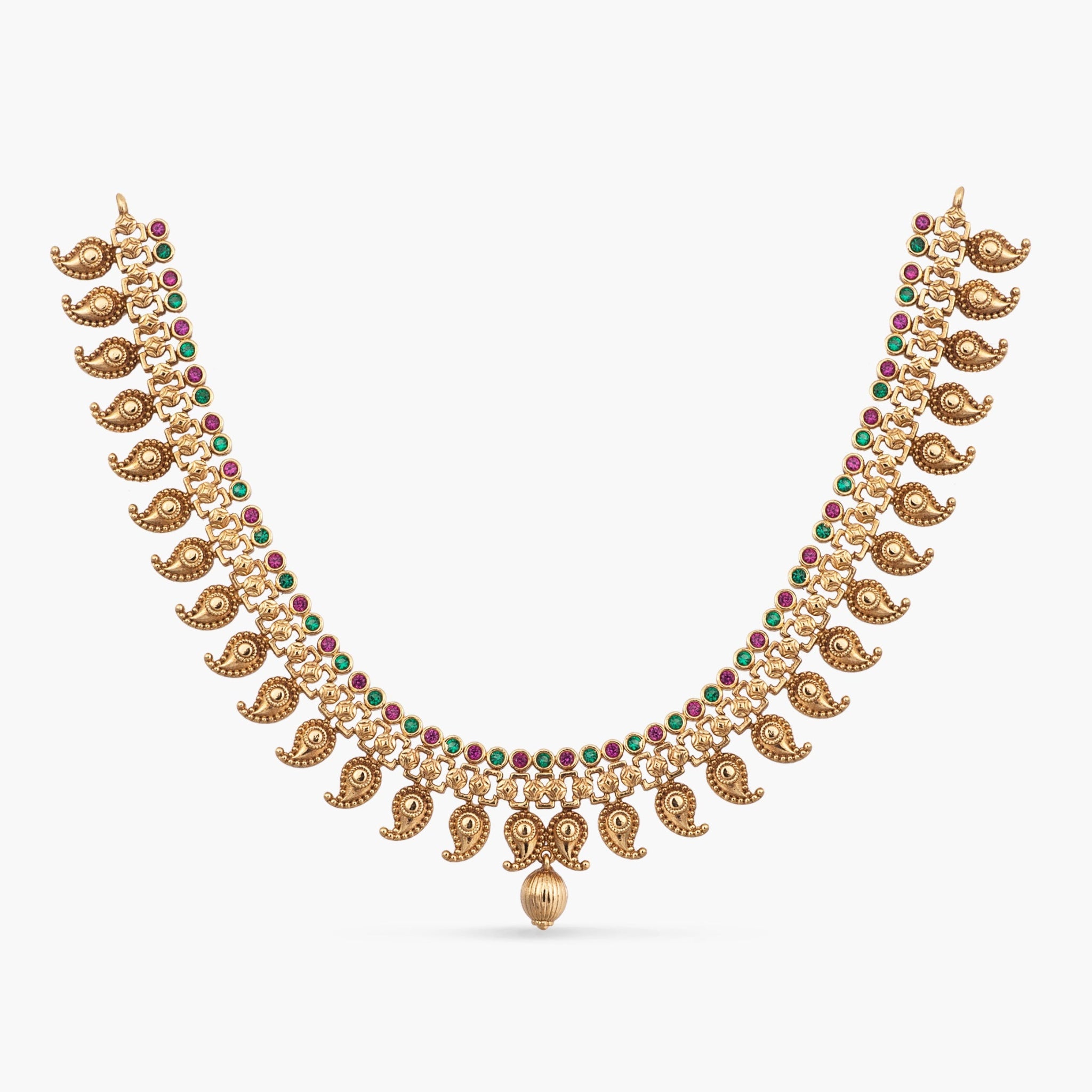 Handcrafted in 925 silvers, this necklace showcases detailed mango motifs with intricate kempu stone settings. A statement piece that honors traditional temple jewelry craftsmanship, ideal for bridal and festive wear.
