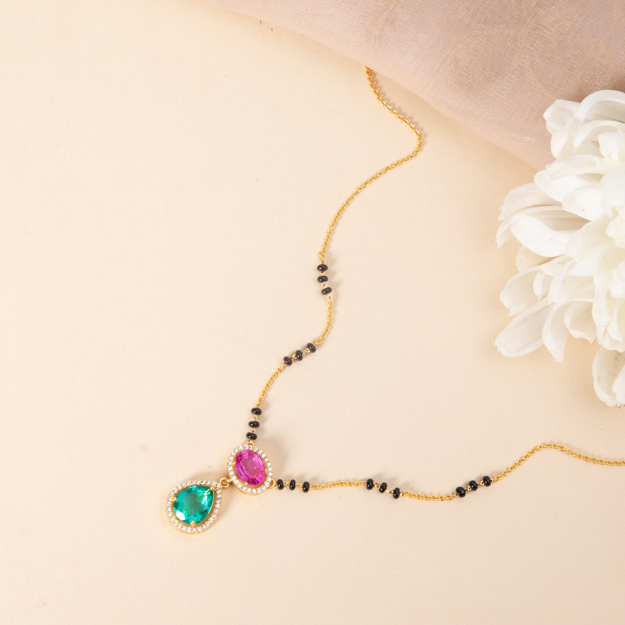A unique mangalsutra design for the modern woman, featuring a single chain with a vibrant pink and green stone drop. Crafted in 925 silvers, this contemporary mangalsutra is designed to be your go-to pick for an effortless, elevated look every day.