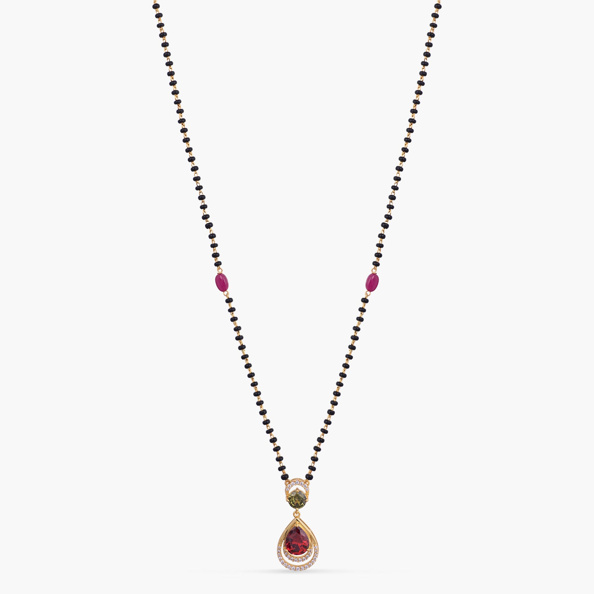 This unique mangalsutra design features a single chain of black beads accented by two playful pink beads and a green and red cz focal point. Crafted in 925 silvers, it’s a vibrant update to a traditional essential.
