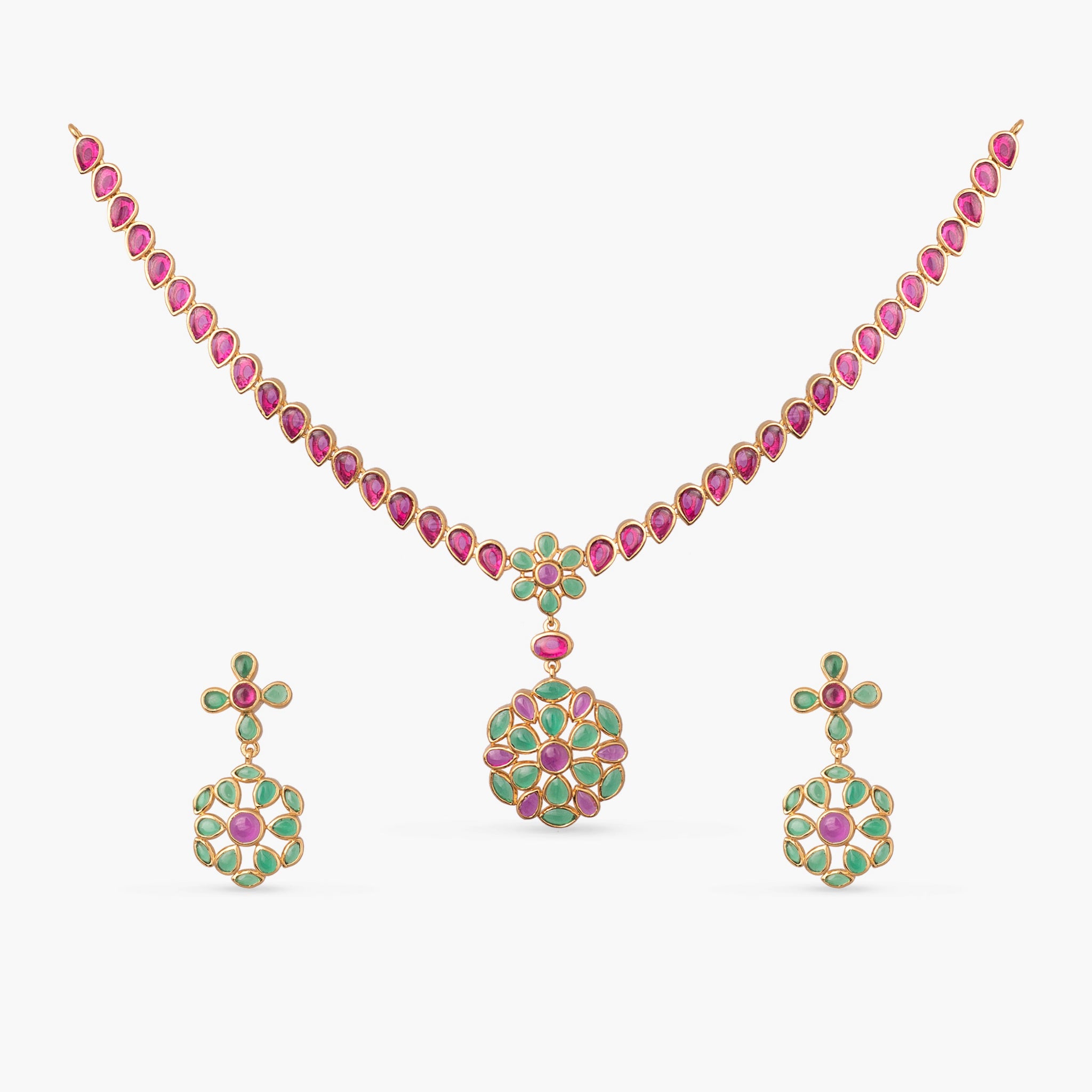 Handcrafted in 925 silvers with classic red-green stones, this necklace set brings festive color and refined sparkle. The balanced silhouette sits beautifully on sarees and lehengas. Lightweight yet striking, it’s ideal for pujas, family gatherings, and festive nights.