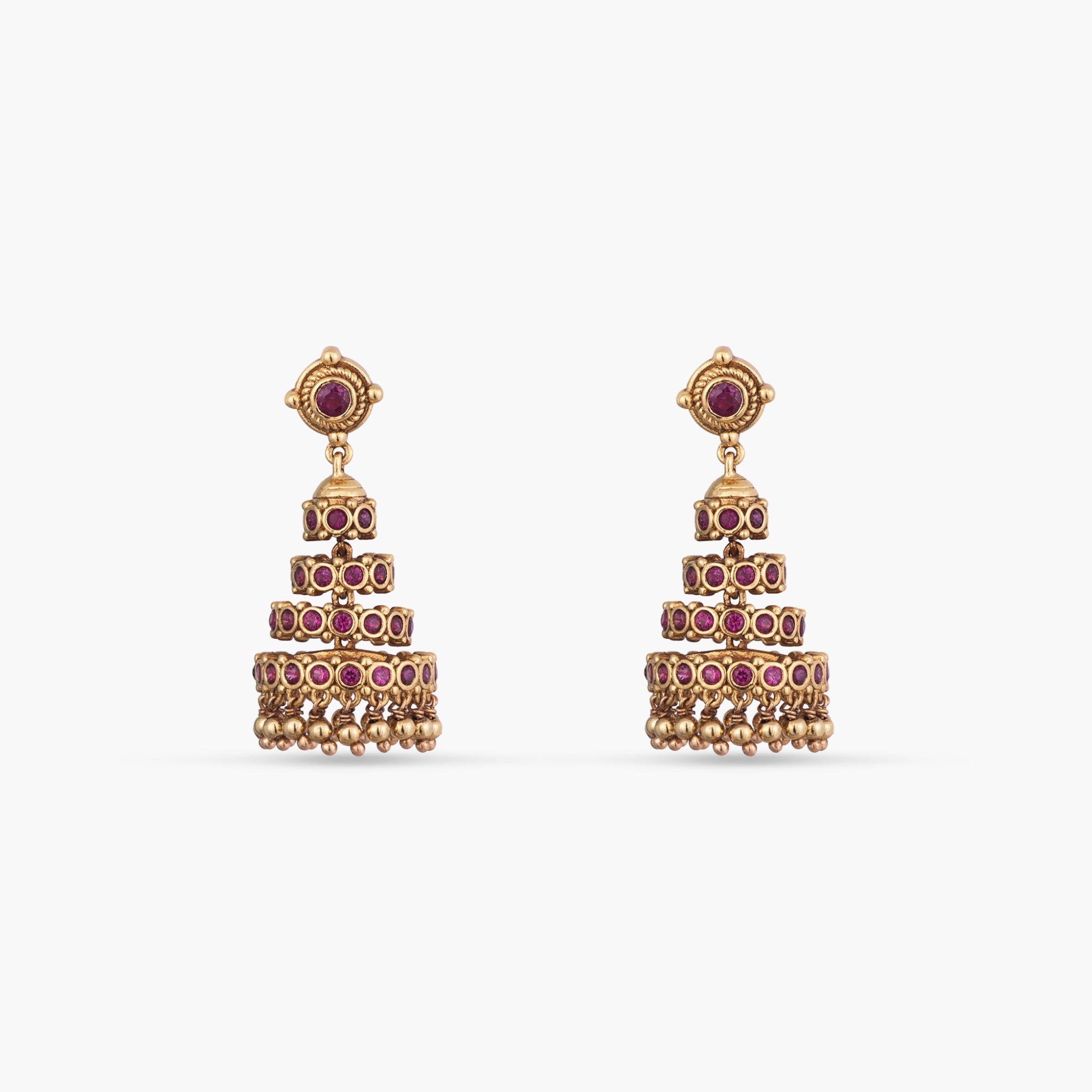 Handcrafted in 925 silvers, these chandelier-style jhumkas feature layered tiers adorned with red kempu stones. A statement piece designed for weddings, festive occasions, and celebrations that call for something striking.