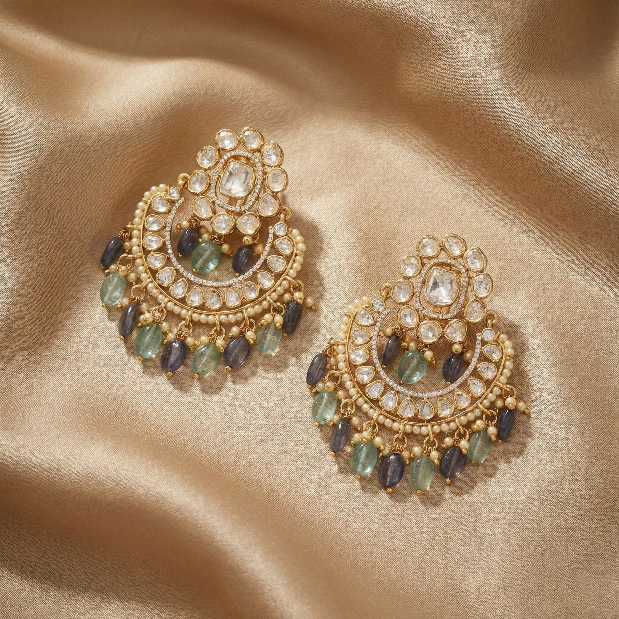 These 925 silver chanbalis are inspired by floral patterns. The stud and the crescent part is encrusted with sparkling moissanite stones arranged together in jadau craftsmanship. This gold plated earrings is an attire enhancer that is finished with an array of cluster pearl drops and blue and turquise semi precious beads.
