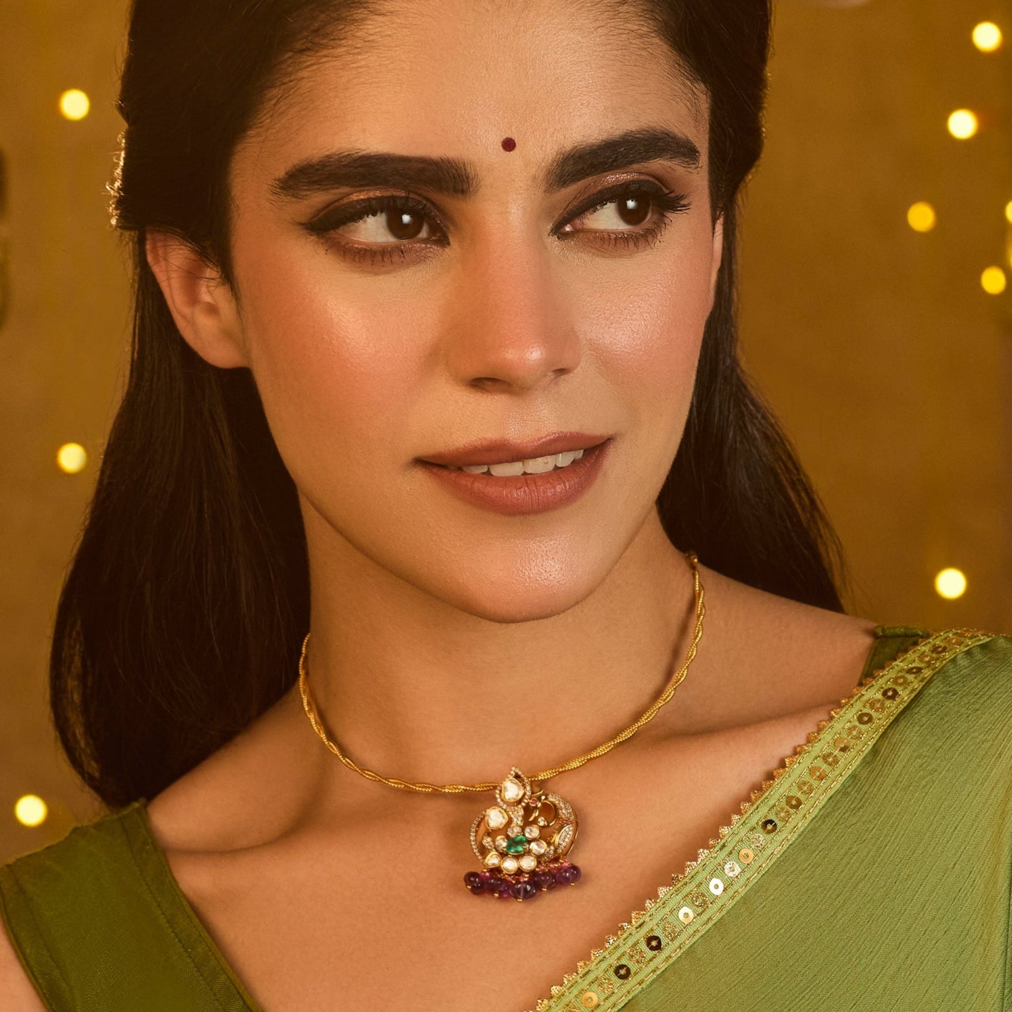 A stunning celebration of artistry, this handcrafted 925 silver necklace features a peacock pendant adorned with moissanite stones and delicate purple bead drops — an exquisite choice for special occasions.