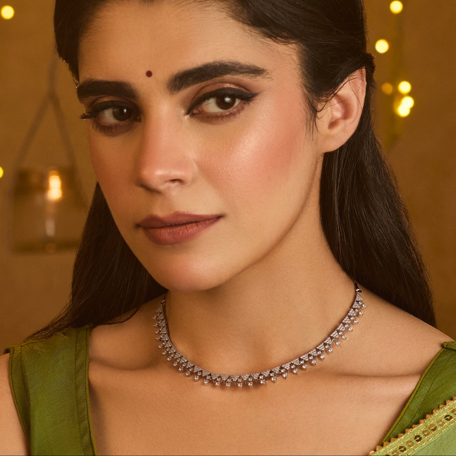 A statement in dainty grandeur, this 925-silver necklace combines intricate CZ artistry with refined proportions. Perfect for festive soirées, weddings, or evening events where you want to stand out with grace.