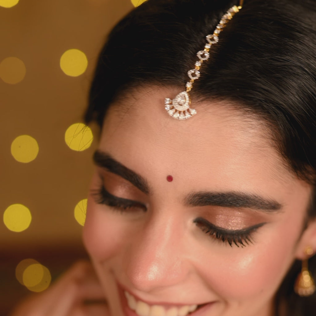 Dainty and sparkly, this CZ maang tikka is handcrafted for a lightweight yet radiant look. A versatile piece that elevates bridal, festive, or sangeet styles with effortless charm.