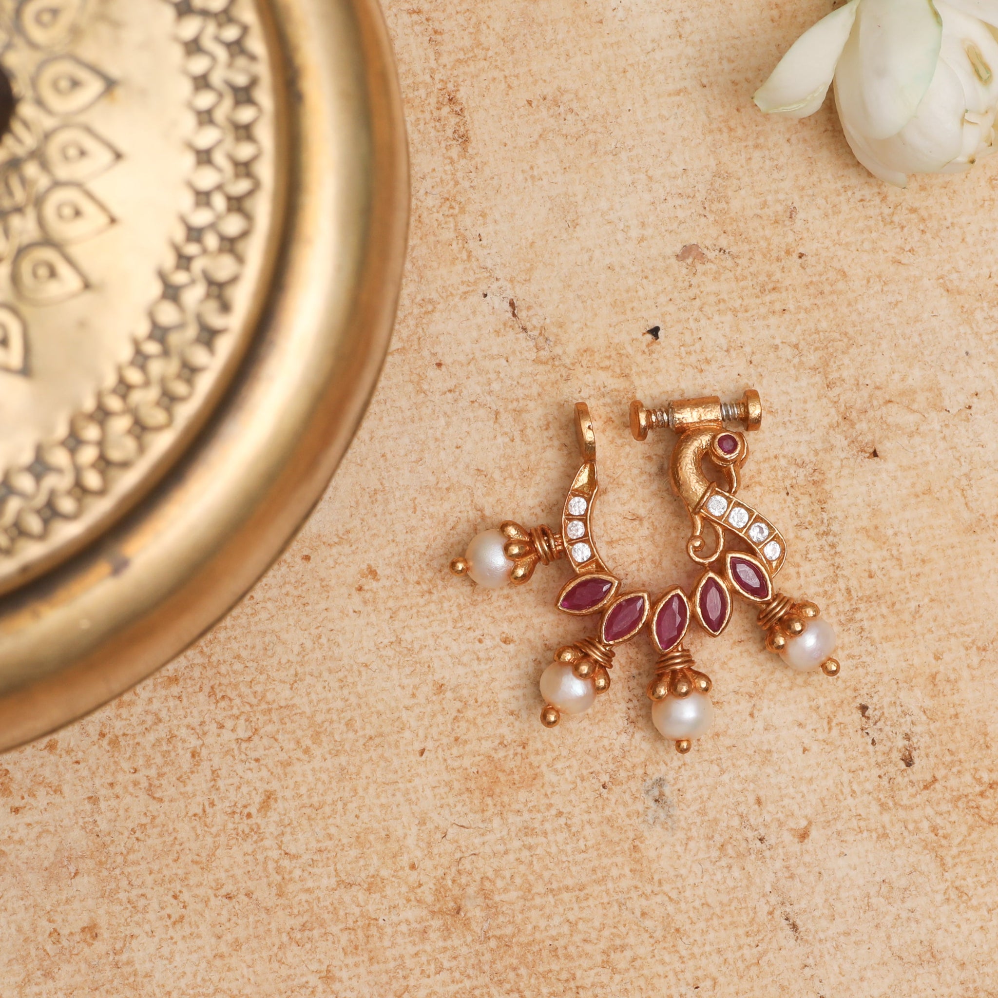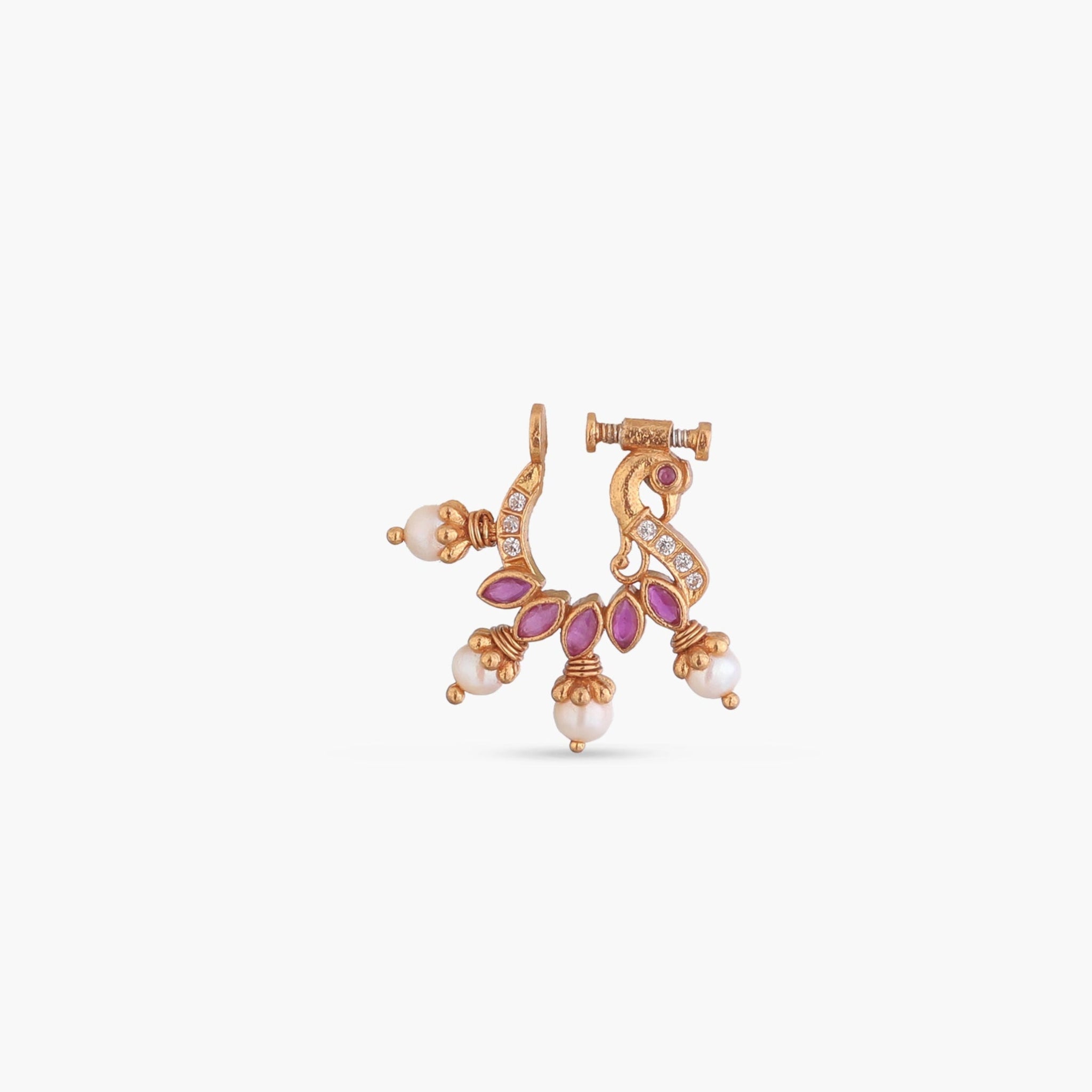 Handcrafted in 925 silvers, this Nose Ring features intricate detailing and vibrant red kempu stones. Ideal for weddings, festive celebrations, or curated jewelry collections.
