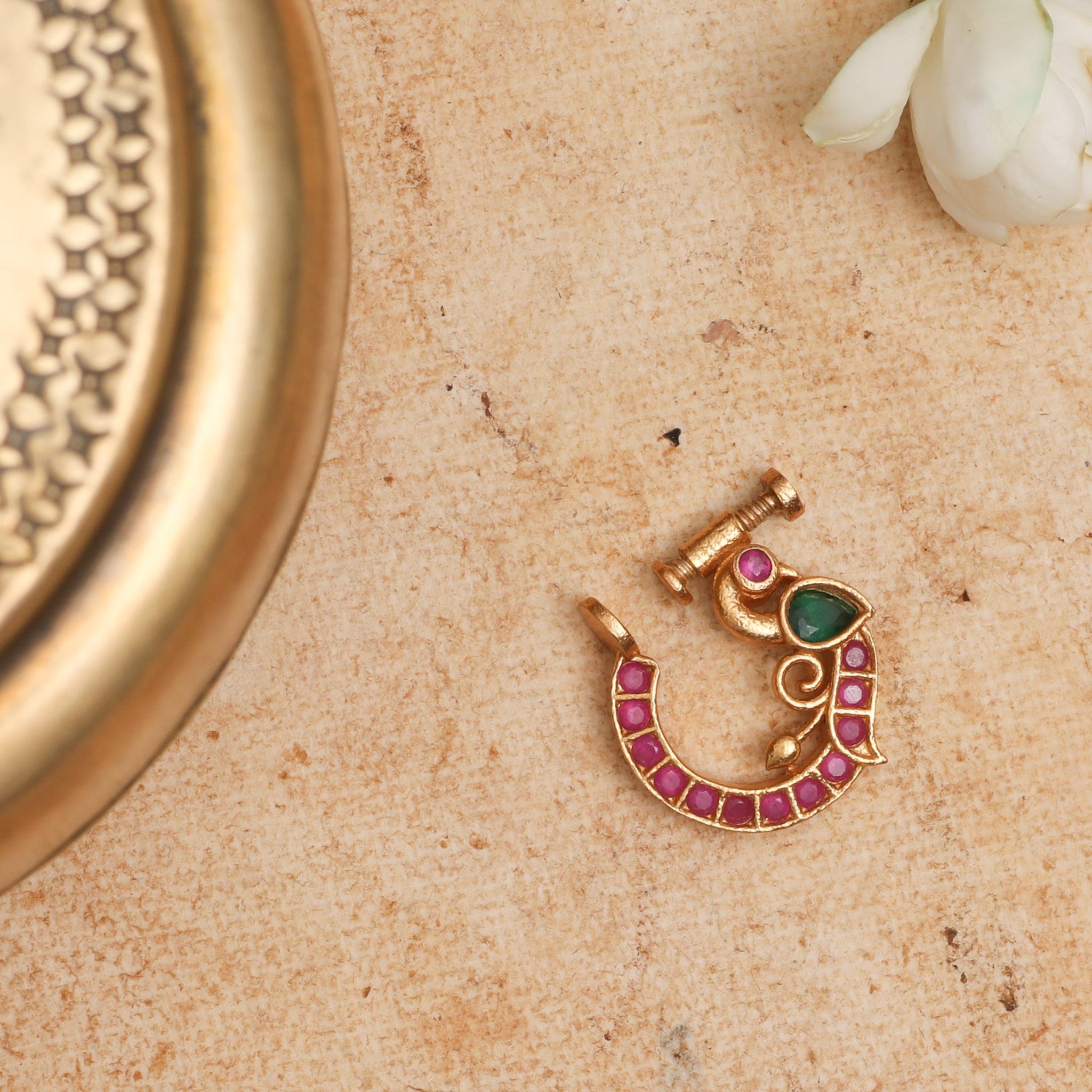 A striking bird motif nose ring with rich red kempu stones, handcrafted in 925 silvers for an eye-catching effect. Ideal for brides, festive occasions, or anyone looking to make a subtle statement with traditional charm.